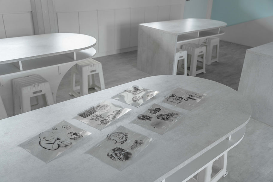 .我們首先統一了教室的色系,以淺灰與水藍色,呈現專業、科學的空間氛圍,並在教室後方設計一面展示牆,並替學校設計一系列可替換式的教具,隨著課程的進行,後方的教具也隨之替換,讓學生課餘時間也能主動、好奇的時常到展示牆學習。